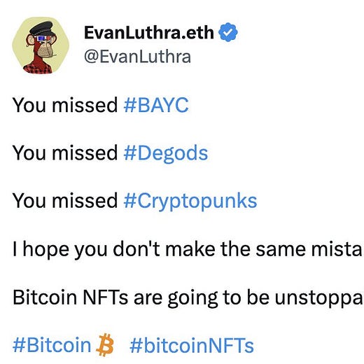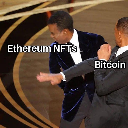 Bitcoin NFTs (hay Ordinal NFTs) là keyword được nhắc đến nhiều trong thời gian vừa qua. Đây là một dạng cho phép user mint NFT trên Bitcoin blockchain. Được đánh giá là khá phức tạp trong việc tạo cũng như giao dịch NFT; OTC hiện là hình thức giao dịch phổ biến. Điều này dẫn tới hoài nghi về sự phát triển trong tương lai xa của NFT trên BTC. Tuy nhiên, nhiều dự án NFT trên ETH đã bridge thành công sang.